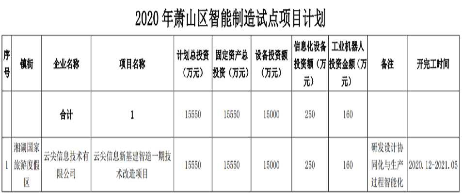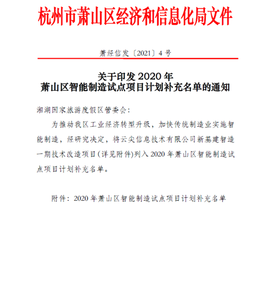 Recently, Yunjian Information new infrastructure intelligent manufacturing phase I technology transformation project successfully selected Xiaoshan District intelligent manufacturing pilot project plan.