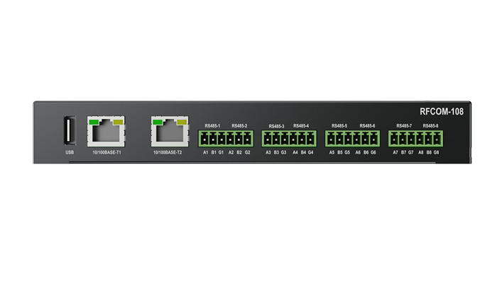 RFCOM-108物聯通信管理機是為工控環境設計的一款多接 口,高性能RS485通信管理終端。 設備集成了主頻高達798Mhz的ARM A7處理器,使用無風 扇靜音設計,適應復雜的工業環境應用; 支持RS485/以太 網等接口;支持WEB遠程配置和控制;支持ModbusRTU, ModbusTCP軟件特性。