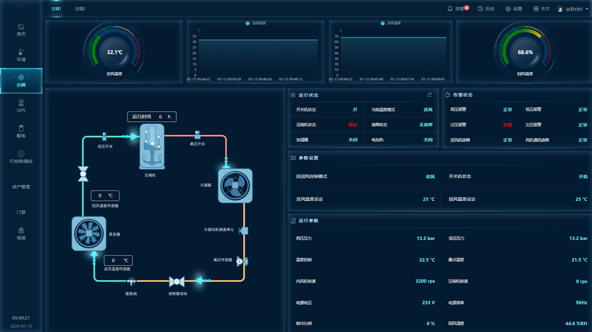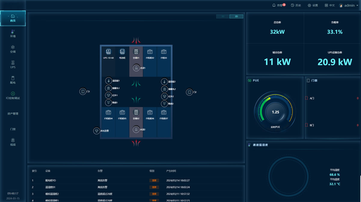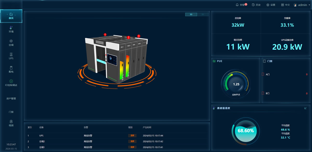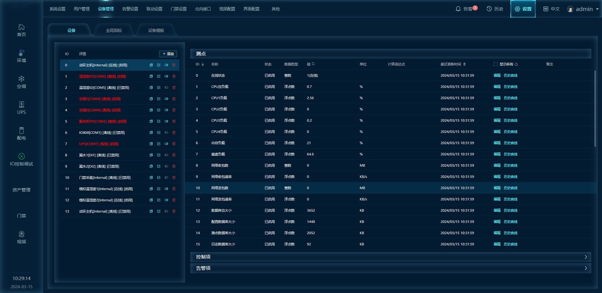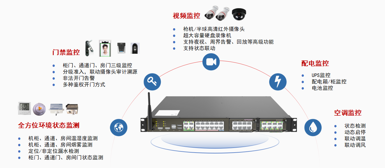系統架構動環系統主要由智慧監控主機、傳感器/控制器、本地控制面板和外部聯動設備(接口)等組件組成,并與運行管理系統軟件共同協作,實現環境監控(煙感、溫濕度、漏水、視頻、門禁)、動力監控(配電柜、UPS、電池、空調),管理監控(資產管理、容量管理、能效管理、3D可視化)等功能。